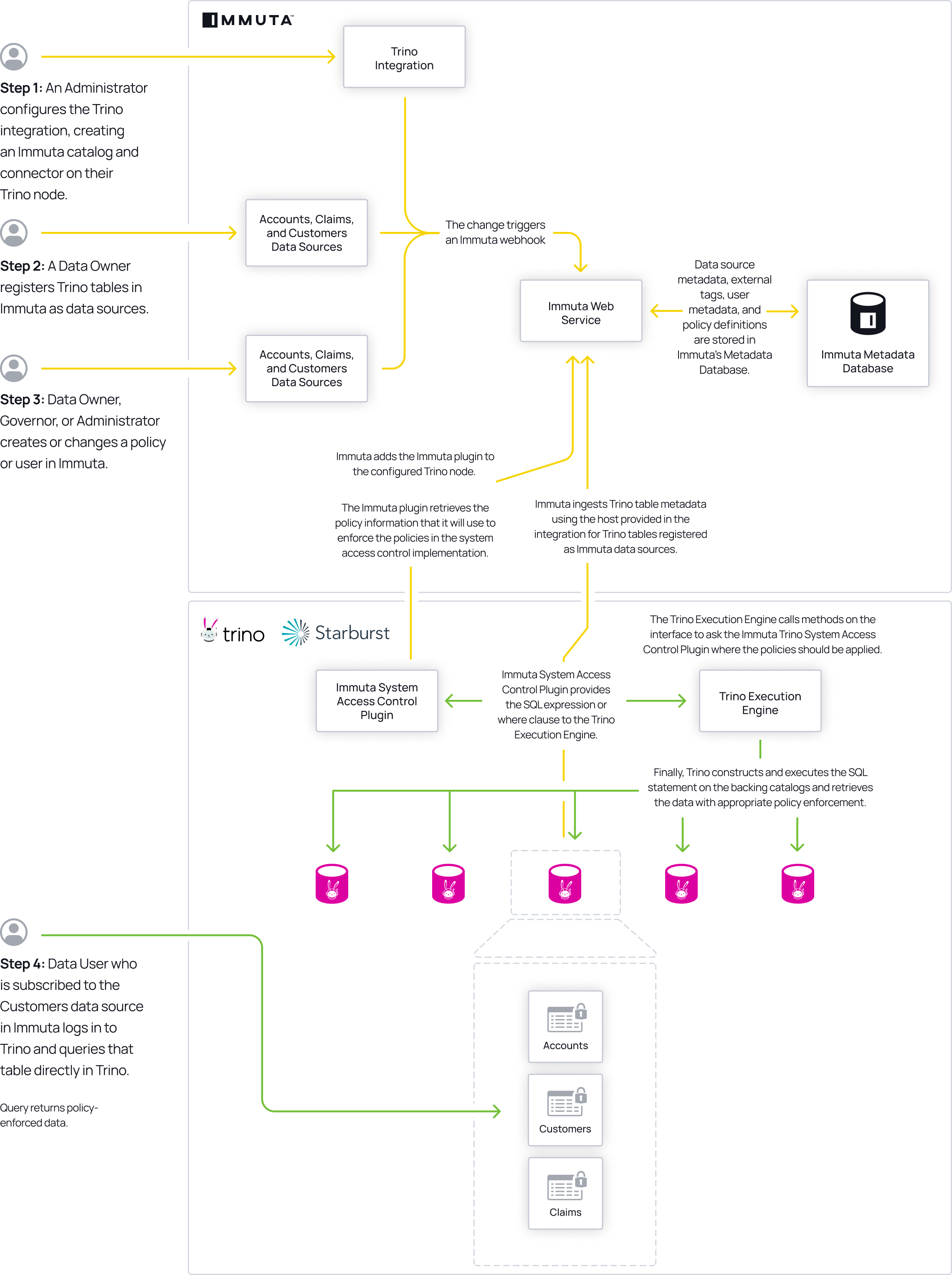 2. A data owner [registers Starburst (Trino) tables in Immuta as data sources](https://documentation.immuta.com/2024.2/data-and-integrations/registering-metadata/register-data-sources/query-backed-tutorial). A data owner, data governor, or administrator [creates or changes a policy](https://documentation.immuta.com/2024.2/secure-your-data/authoring-policies-in-secure/data-policies/how-to-guides/data-policy-tutorial) or user in Immuta.