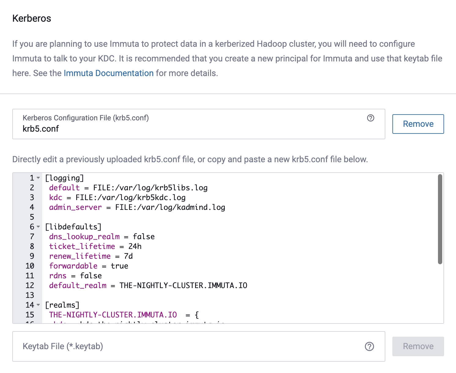 Upload your Kerberos Configuration File, and then you can add modify the Kerberos configuration in the window pictured below.