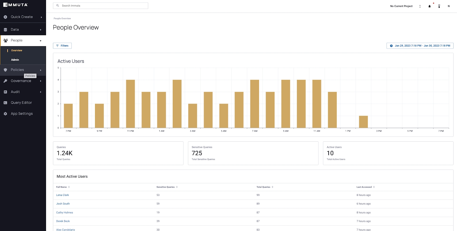 Immuta Detect is a tool that monitors your data environment and provides analytic dashboards in the Immuta UI based on your data use. These dashboards offer visualizations of audit events, including user queries and when Discover classification is enabled, the sensitivity of those queries, data sources, and columns. It can work within your current Immuta integration.