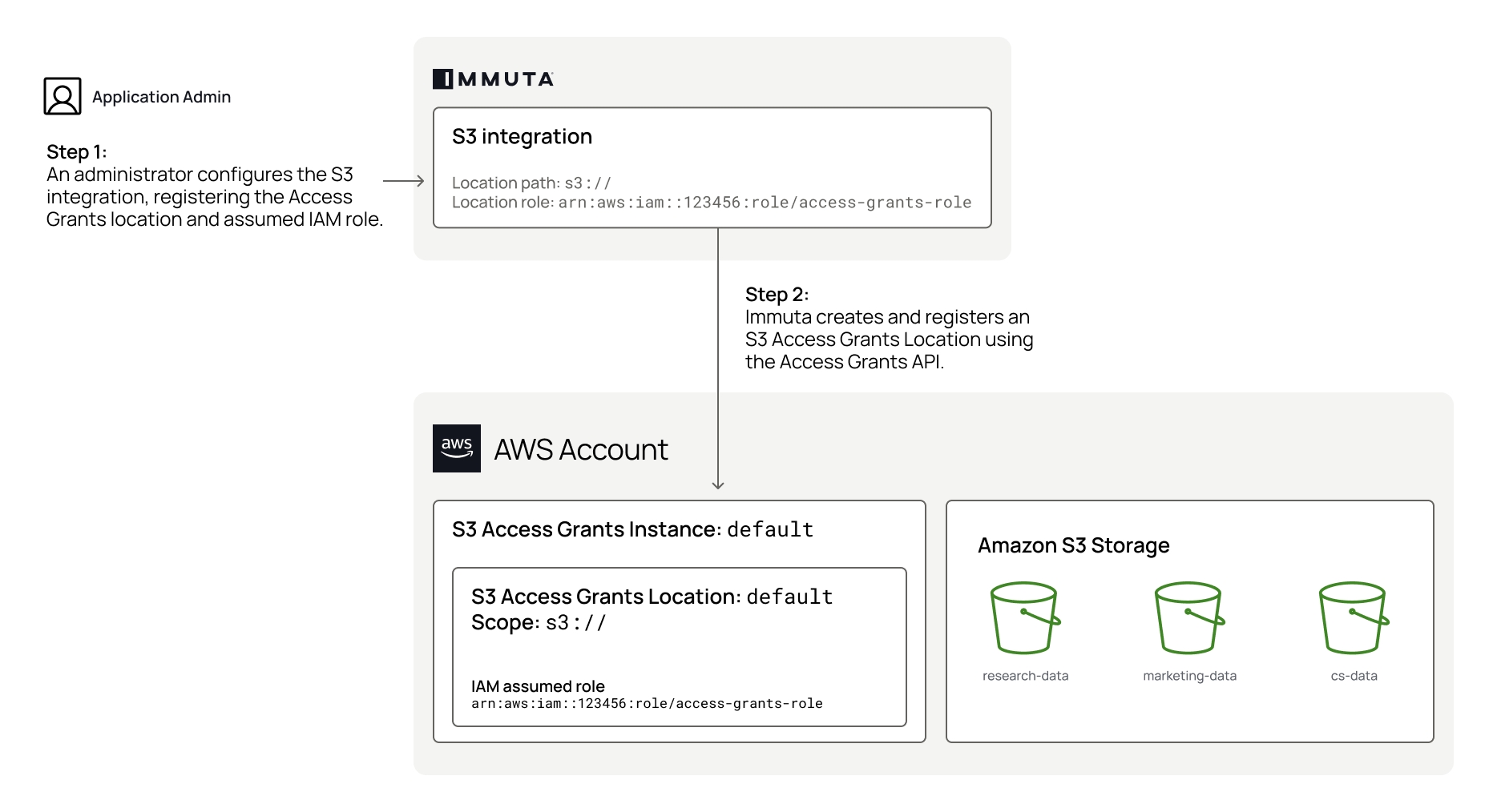 After an administrator creates an Access Grants instance and an assumed IAM role in their AWS account, an application administrator configures the Amazon S3 integration in Immuta. During configuration, the administrator provides the following connection information so that Immuta can create and register a location in that Access Grants instance: