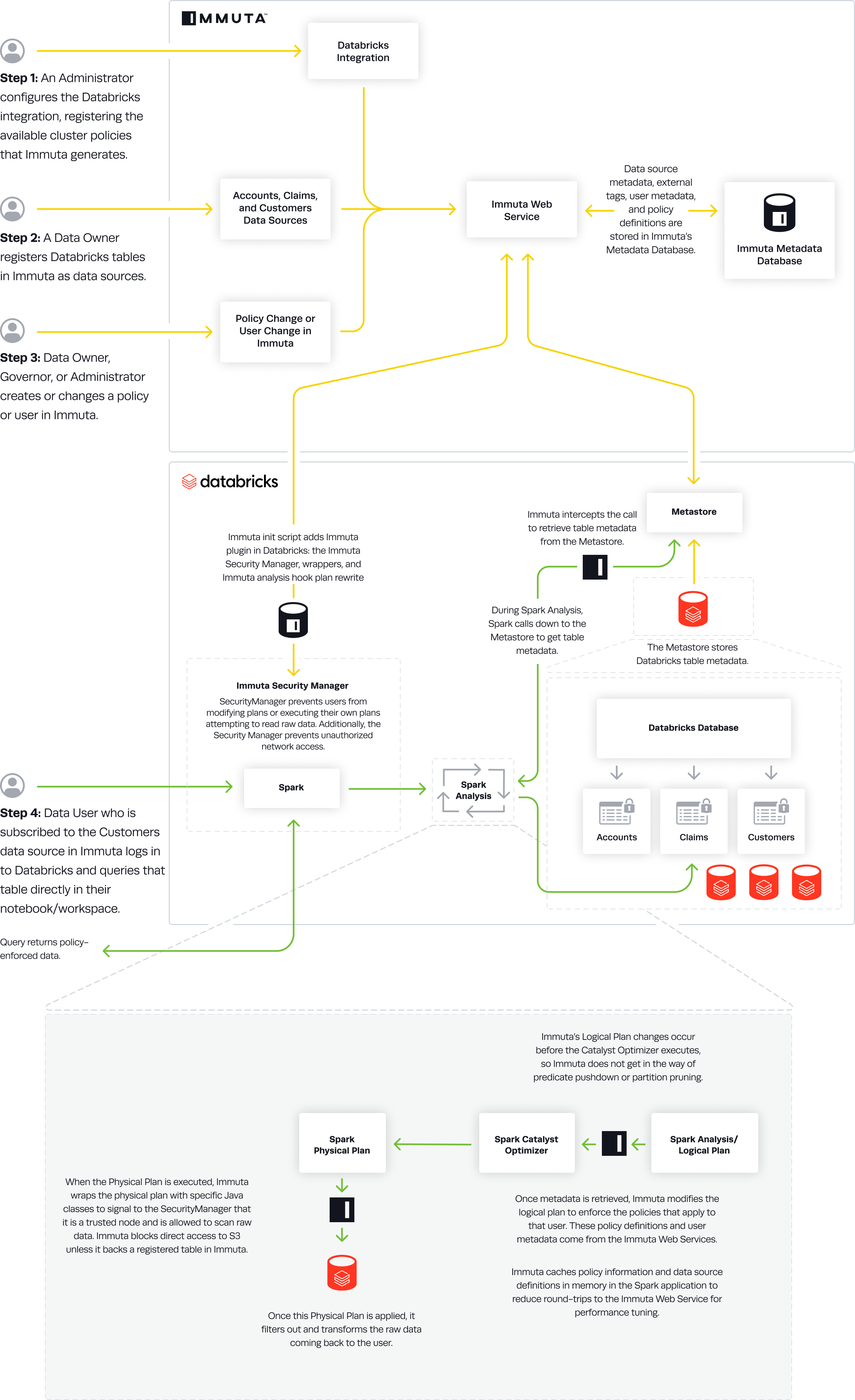 Databricks Spark is a plugin integration with Immuta. This integration allows you to protect access to tables and manage row-, column-, and cell-level controls without enabling table ACLs or credential passthrough. Policies are applied to the plan that Spark builds for a user's query and enforced live on-cluster.