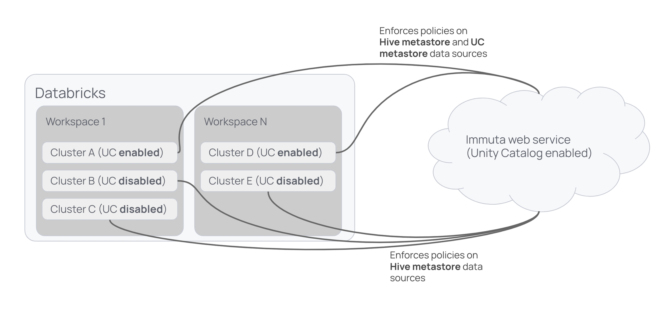 In clusters A and D, Immuta enforces policies on data sources in each workspace's Hive metastore and in the Unity Catalog metastore shared by those workspaces. In clusters B, C, and E (which don't have Unity Catalog enabled in Databricks), Immuta enforces policies on data sources in the Hive metastores for each workspace.