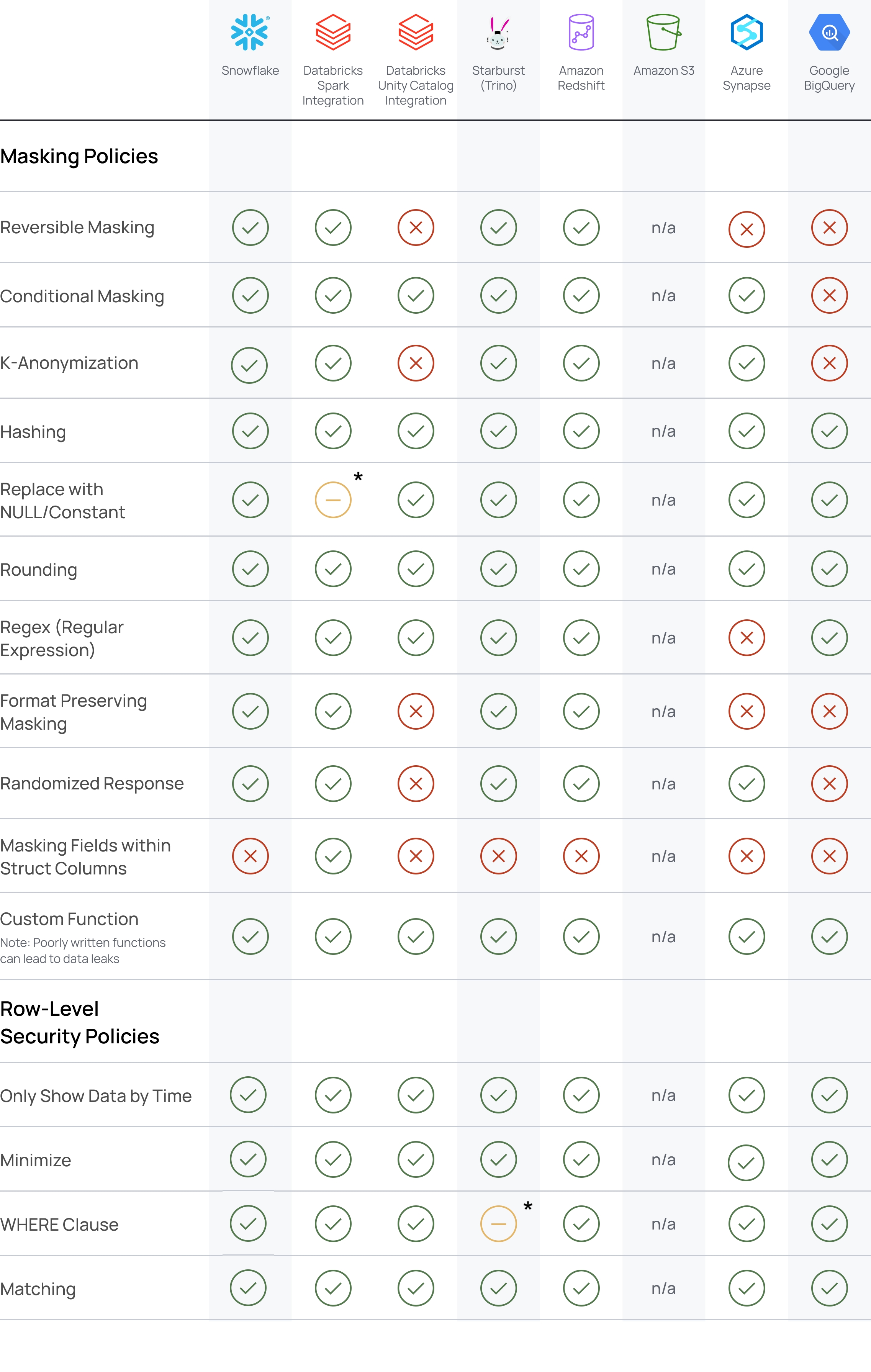 On Databricks data sources, joins will not be allowed on data protected with replace with NULL or constant policies.