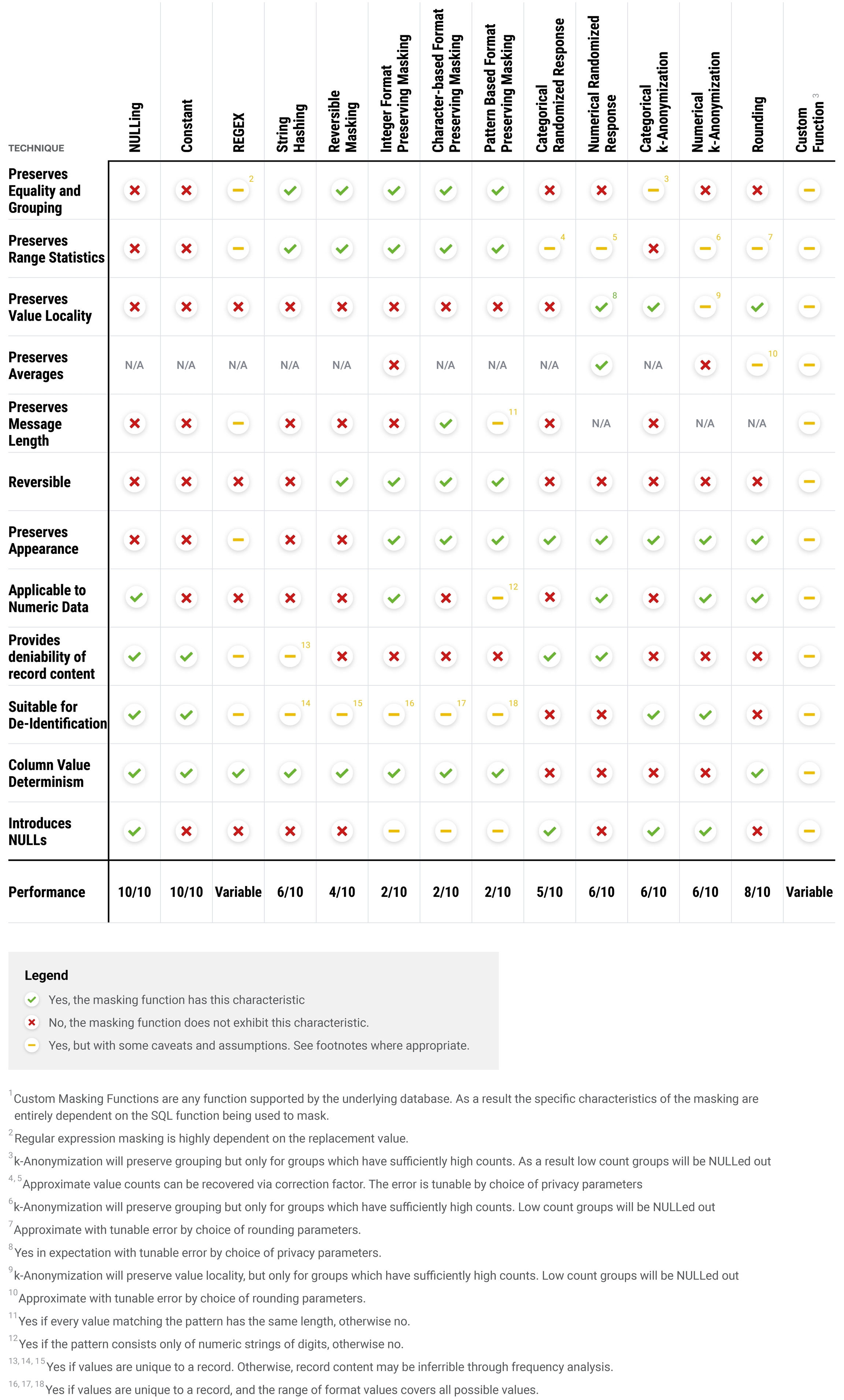 Preserves Appearance: The output masked value resembles the valid column values. For example, a masking function would output phone numbers when given phone numbers. Here, NULL values are not counted against this property.