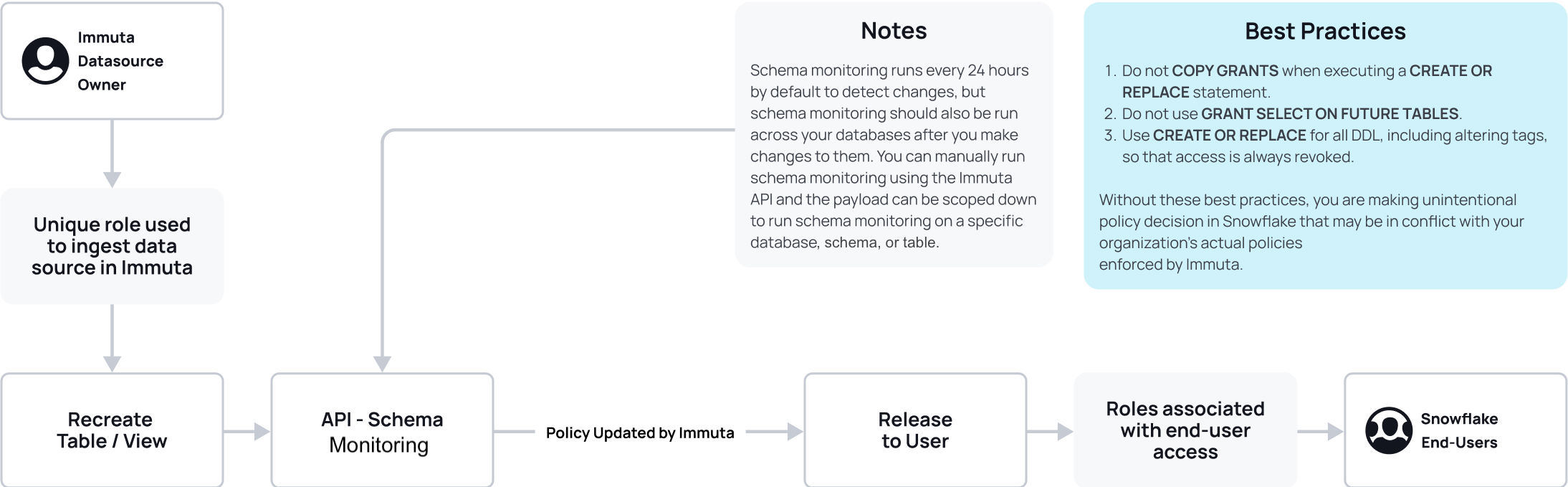 For example, if the `CREATE OR REPLACE` added a new column that contains sensitive data, and the user `COPY GRANTS`, it opens that column to users, causing a data leak. Instead, access must be blocked using the above data downtime techniques until Immuta has synchronized.