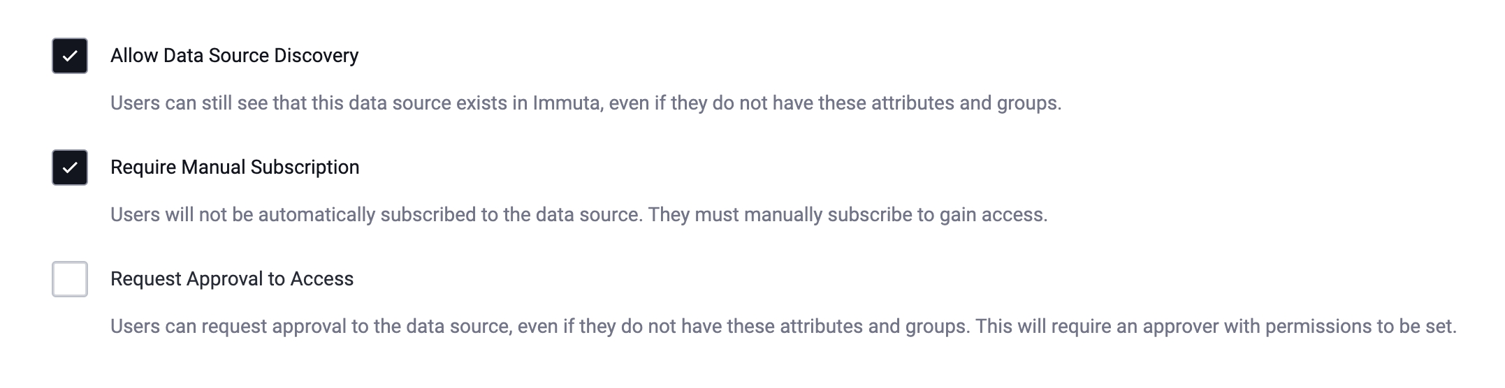 Allow Data Source Discovery: Normally, if a user does not meet the subscription policy, that data source is hidden from them in the Immuta UI. Should you check this option when building your subscription policy, the inverse is true: anyone can see this data source. This is important if you want users to understand if the data product exists, even if they don't have access.