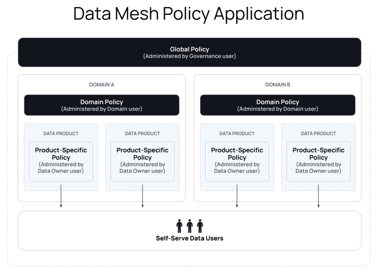 In the distributed domains of a data mesh architecture, data governance and access control must be applied vertically (locally) within specific domains or data products and horizontally (globally). Global policies should be authored and applied in line with the ecosystem’s most generic and all-encompassing principles, regardless of the data’s domain (e.g., mask all PII data). Localized domain- or product-level policies should be fine-grained and applicable to only context-specific purposes or use cases (e.g., only show rows in the Sales table where the country value matches the user's office location). In Immuta we distinguish between subscription policies and data policies.