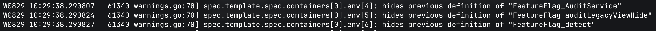 If you fail to migrate the values from `secure.extraEnvVars` to `global.featureFlags` , then Helm will display warnings similar to below: