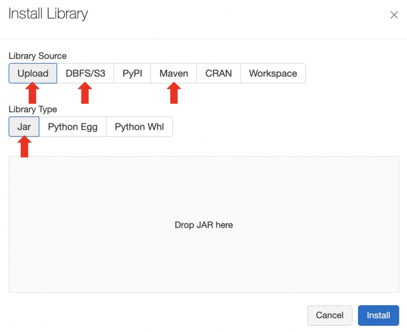 Upload,DBFS,DBFS/S3, orMaven. Alternatively, use the Databricks libraries API.
