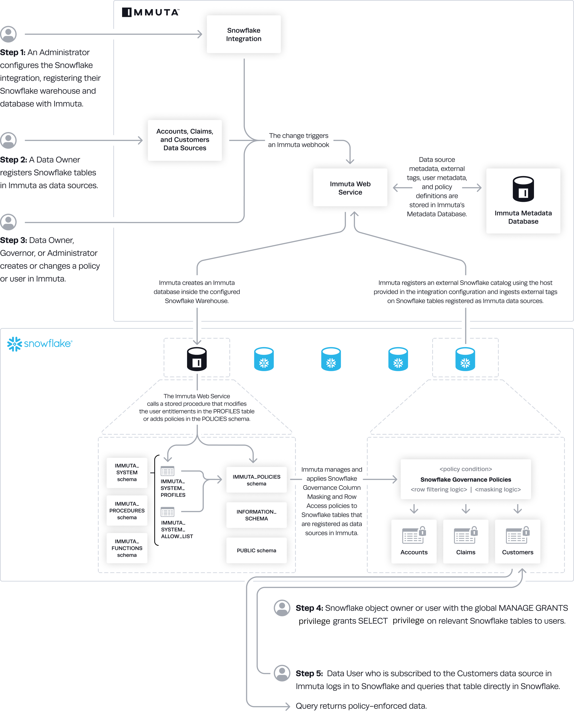 1. An Immuta application administrator [configures the Snowflake integration](https://documentation.immuta.com/2025.1/configuration/integrations/snowflake/how-to-guides/enterprise) and registers Snowflake warehouse and databases with Immuta.