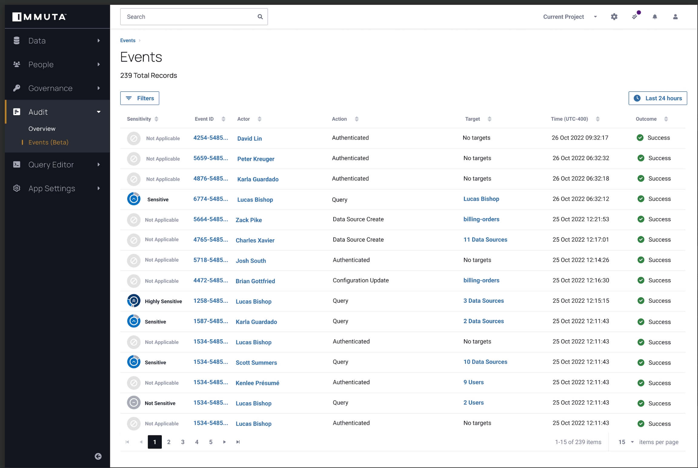 Immuta monitors your data environment and provides analytic dashboards in the Immuta UI based on your data use. These audit dashboards offer visualizations of audit events, including user queries and when classification is enabled, the sensitivity of those queries, data sources, and columns. It can work within your current Immuta integration.