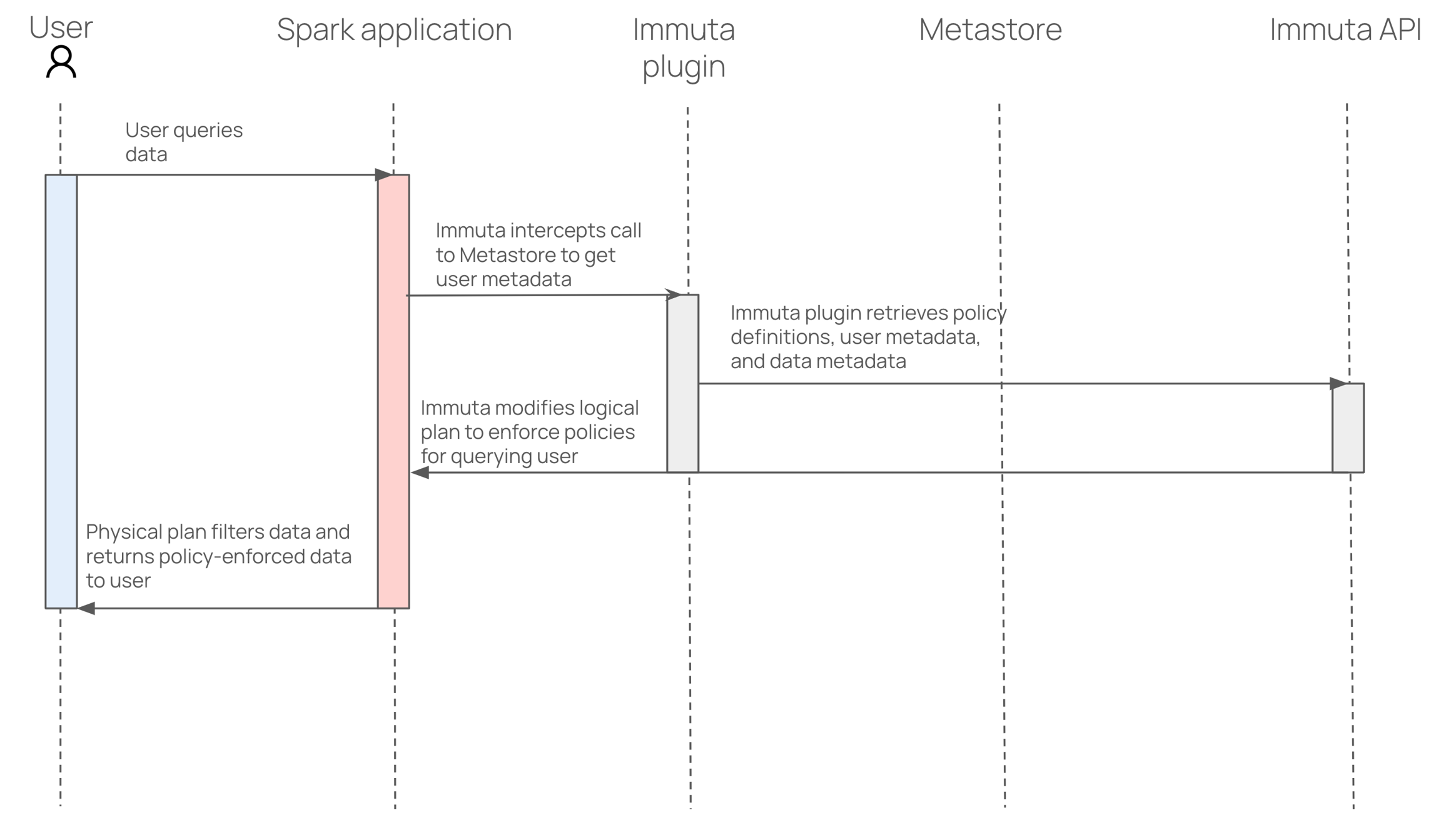 The sequence diagram below breaks down this process of events when an Immuta user queries data in Databricks.