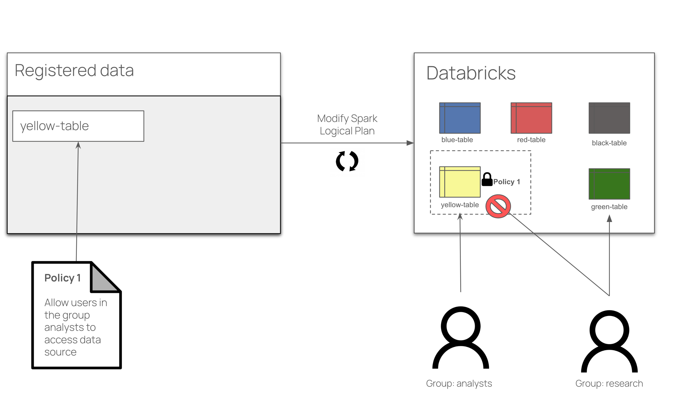 The image below illustrates how Immuta enforces a subscription policy that only allows users in the Analysts group to access the yellow-table.