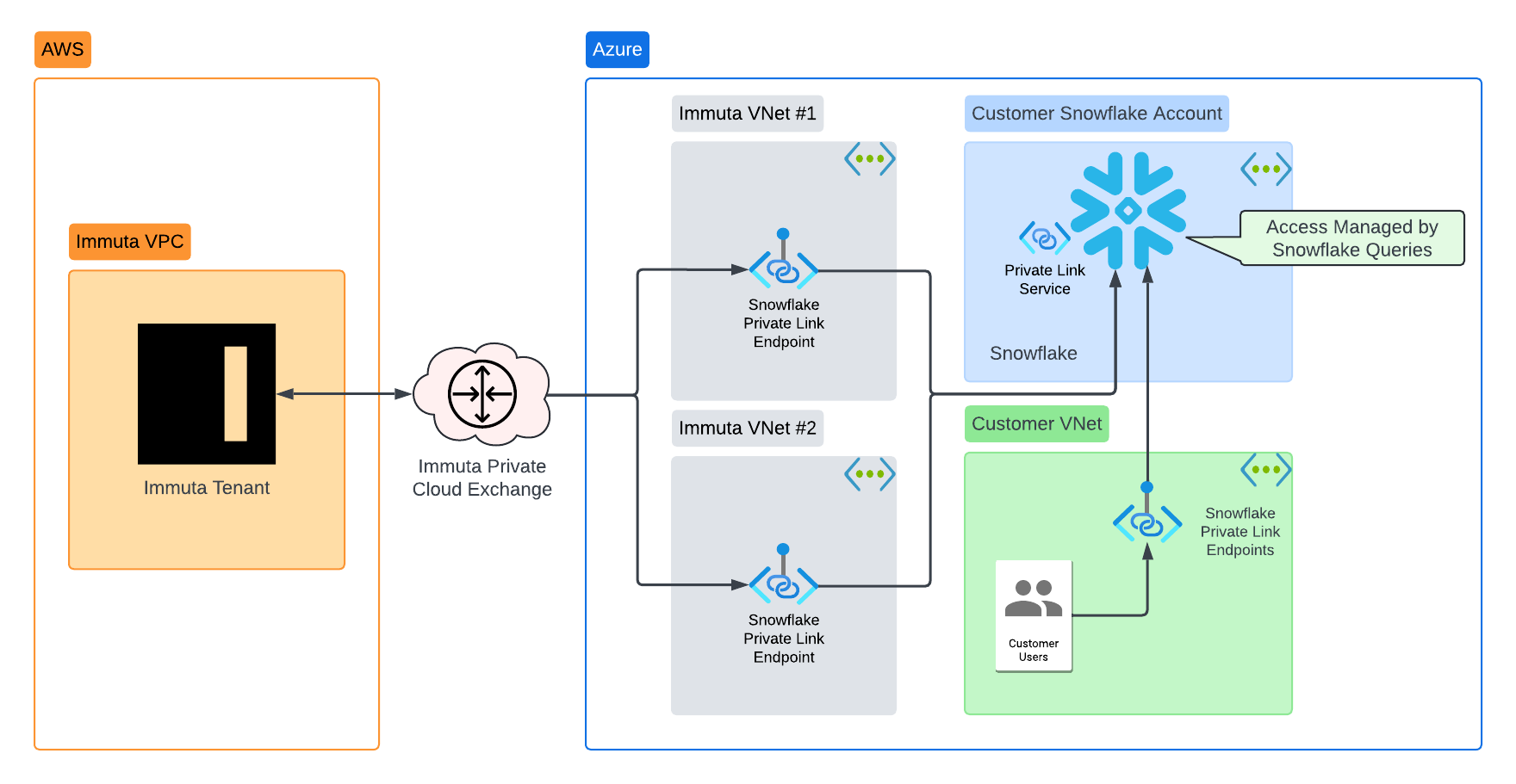 [Azure Private Link](https://learn.microsoft.com/en-us/azure/private-link/private-link-overview) provides private connectivity from the Immuta SaaS platform, hosted on AWS, to Snowflake Accounts on Azure. It ensures that all traffic to the configured endpoints only traverses private networks over the Immuta Private Cloud Exchange.