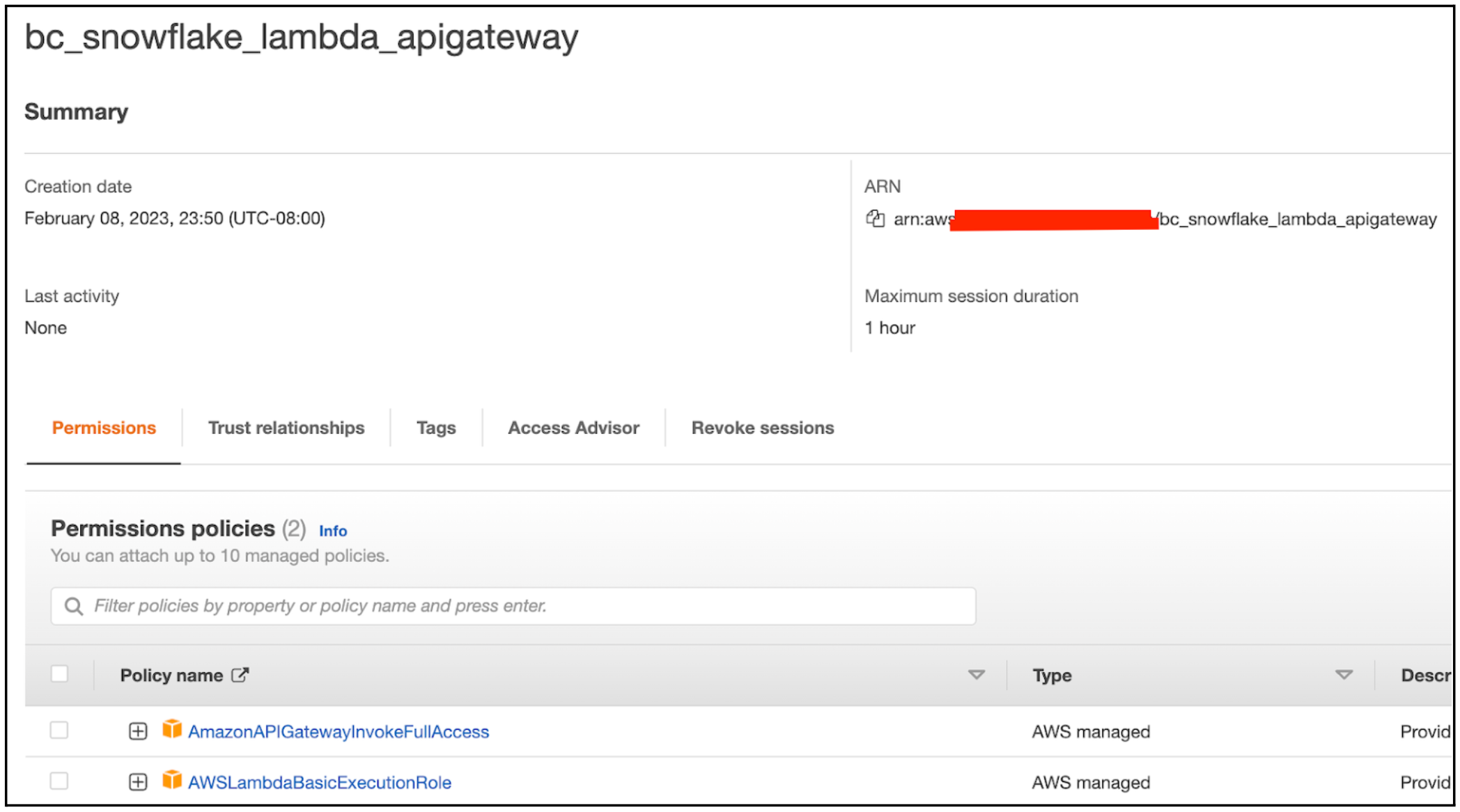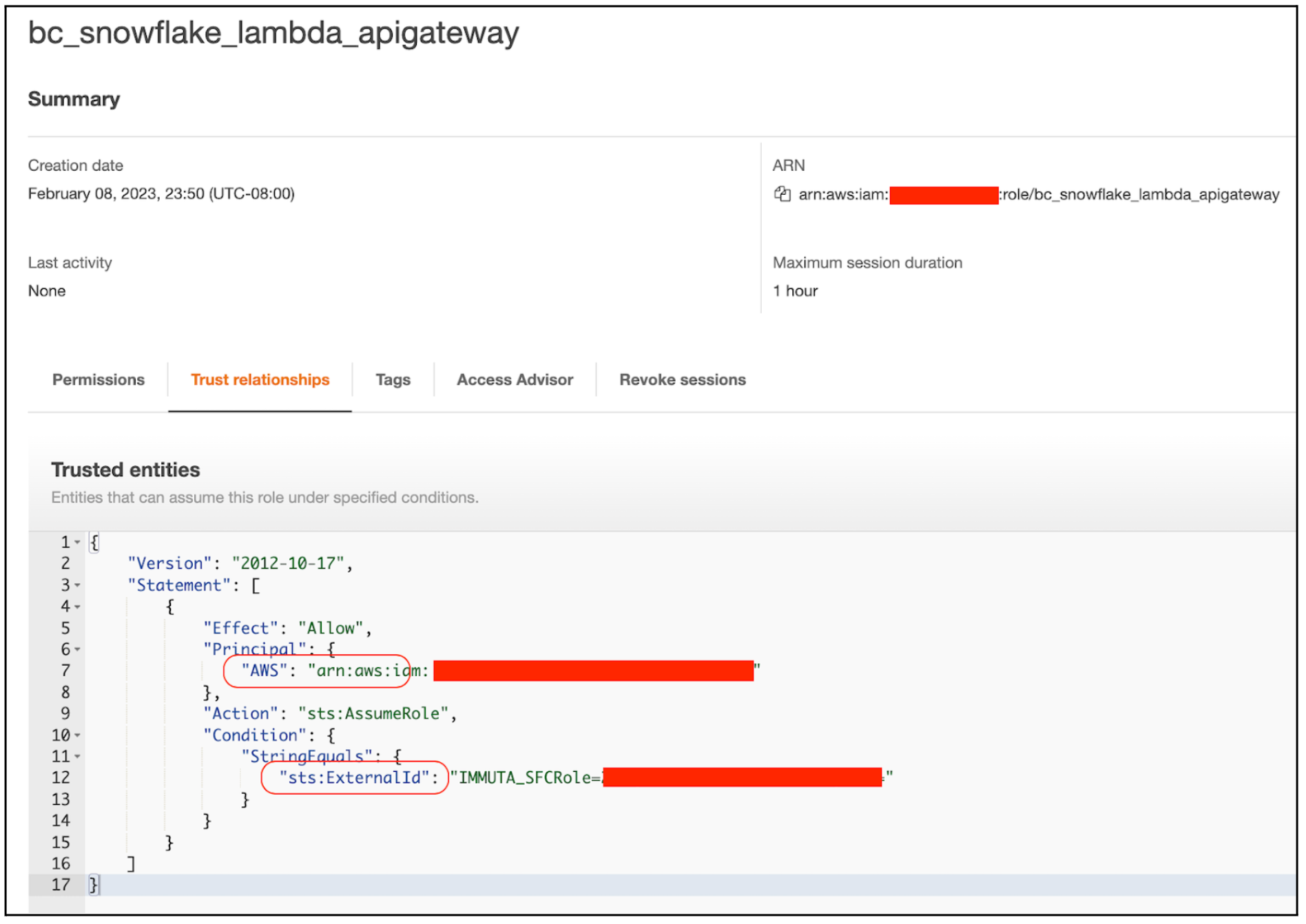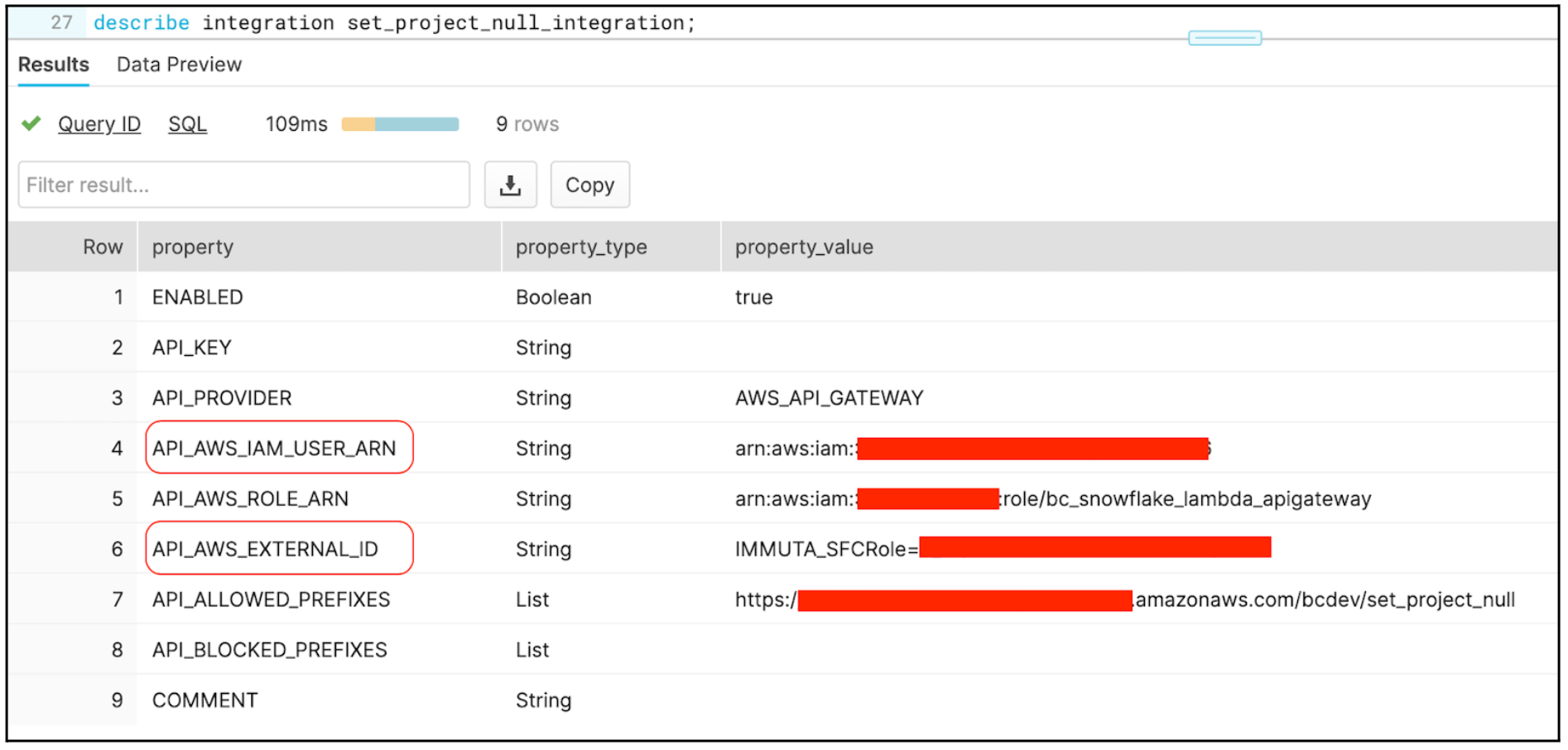 * Describing the Snowflake integration object will provide the `API_AWS_IAM_USE_ARN` and the `API_AWS_EXTERNAL_ID`, which need to be provided to the AWS IAM role on AWS.