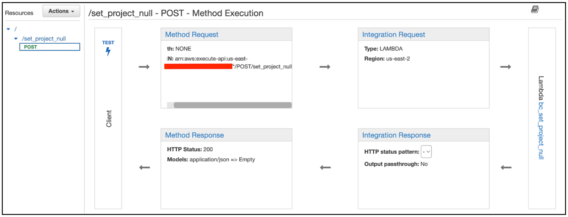 * Associate the Lambda function to the POST request: i.e:  **bc\_set\_project\_null**