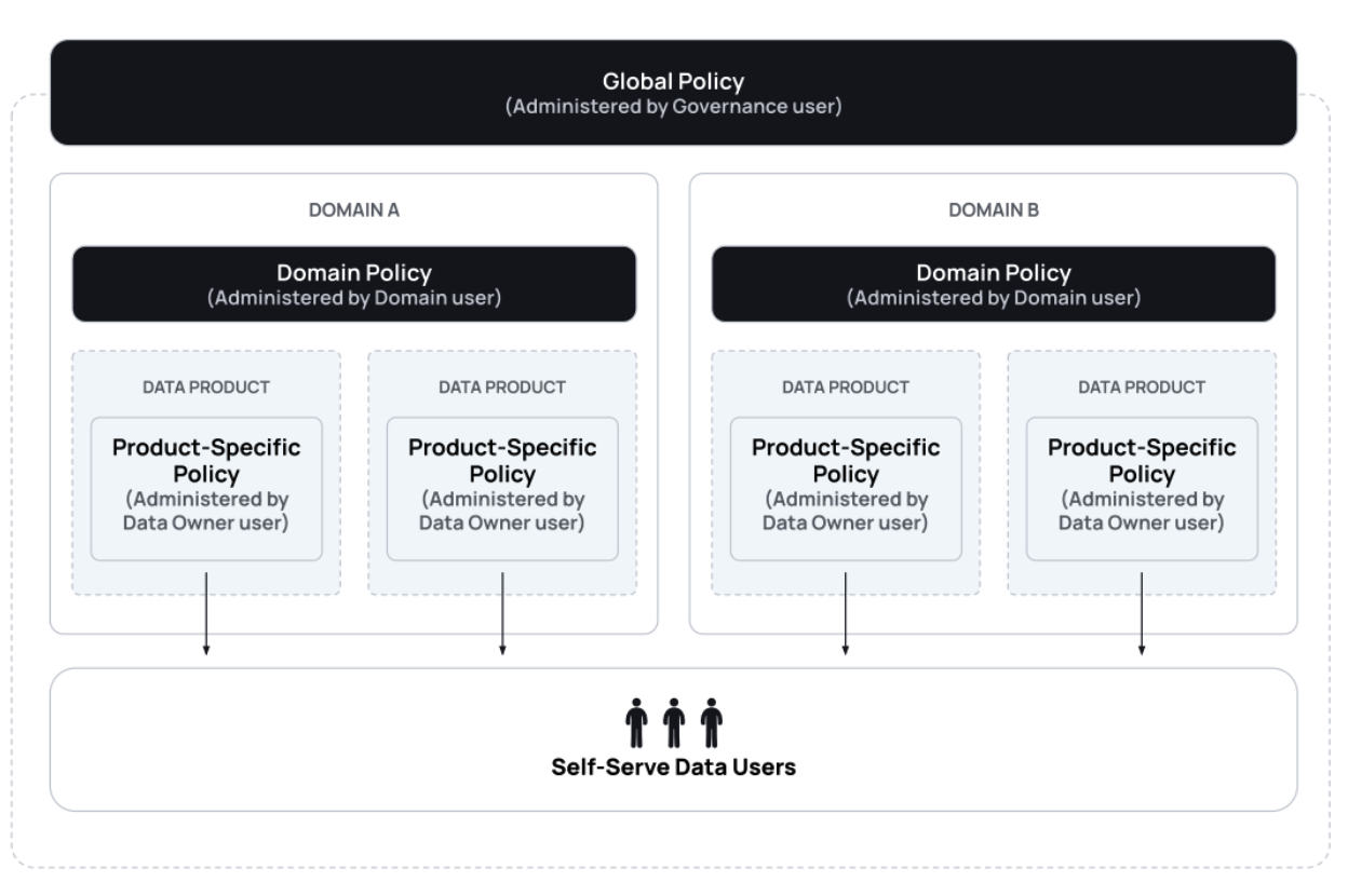 When integrating domains to distribute policy management across your organization, data governance and access control must be applied horizontally (globally across data in your organization) and vertically (locally within specific domains or data products). Global policies should be authored and applied in line with your ecosystem’s most generic and all-encompassing principles, regardless of the data’s domain. For example, a global policy could be used to mask all PII data across an organization. Domain or [local policies](https://documentation.immuta.com/latest/governance/author-policies-for-data-access-control/authoring-policies-in-secure/policies-explained), on the other hand, should be fine-grained and applicable to only context-specific purposes or use cases. For example, a domain or local policy could be used to only show rows in the `Sales` table where the value in the `country` column matches the user's office location.