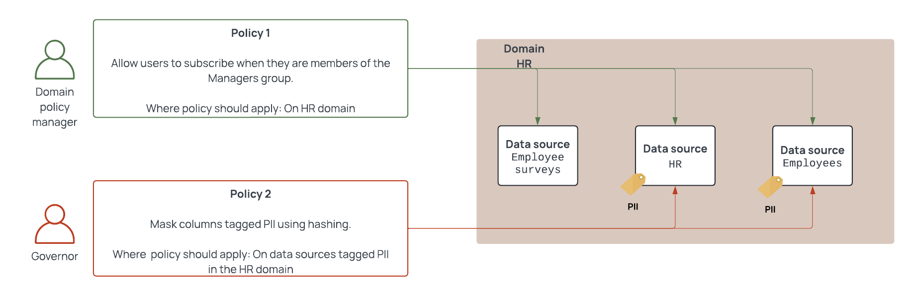 If that same user had the `Manage Policies` permission for the `HR` and `Marketing` domains, they could write global policies to apply to data sources within both of those domains. If that user had the `Manage Policies` permission on all domains in their organization or the global `GOVERNANCE` permission, they could set global policies to apply to all data sources.