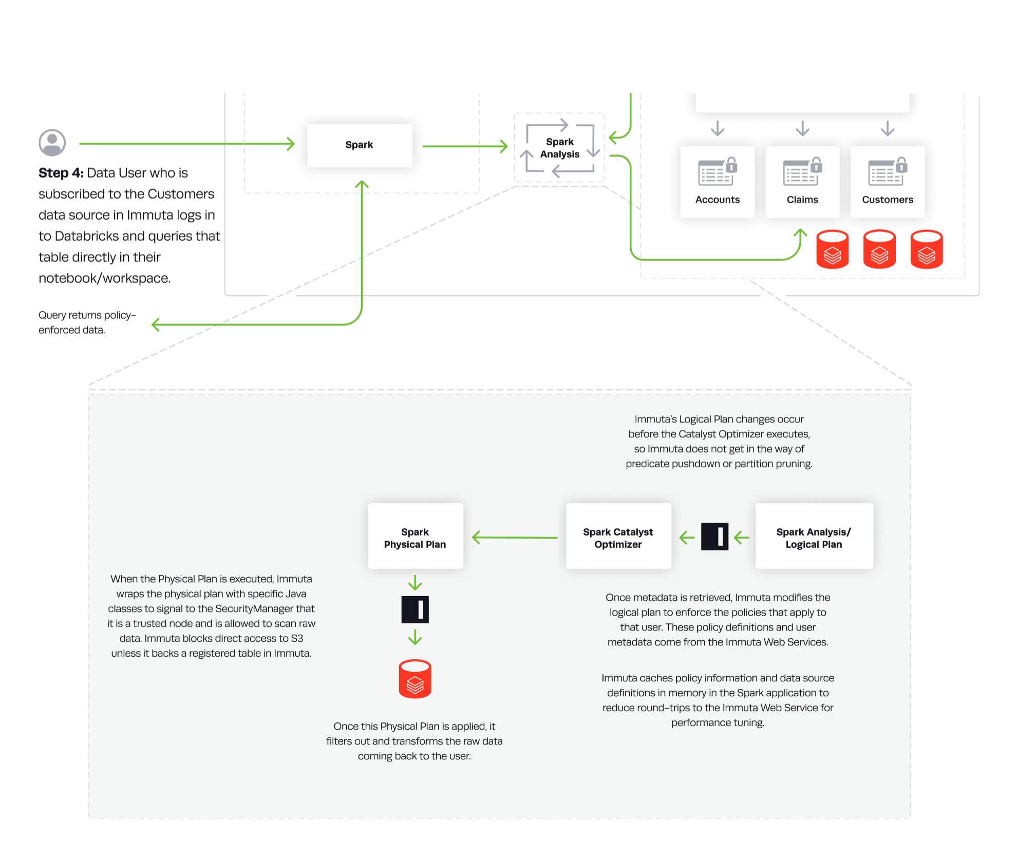 Once a Databricks user who is subscribed to the data source in Immuta queries the corresponding securable directly in their workspace, Spark Analysis initiates and the following events take place: