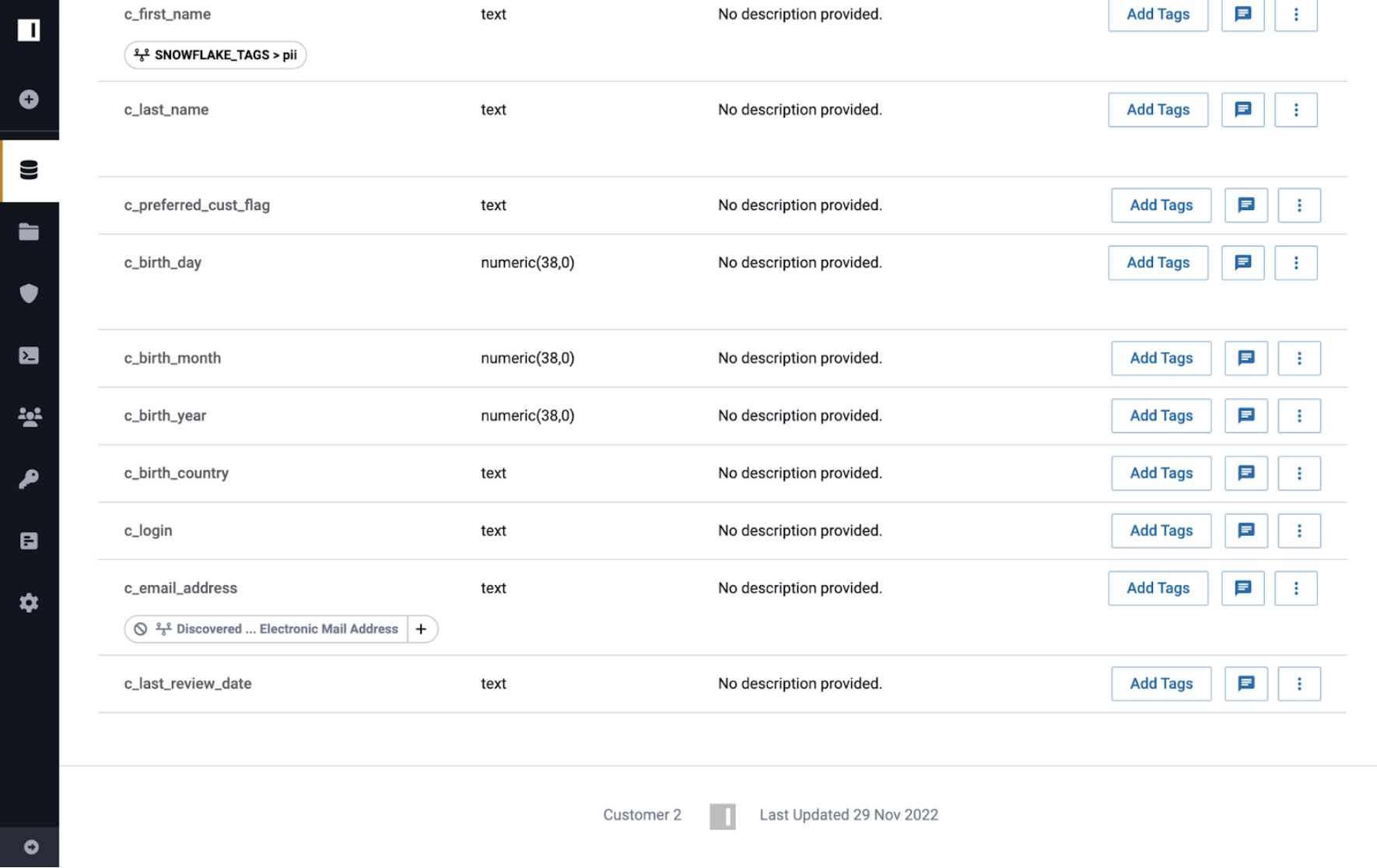 If the Discovered.Electronic Mail Address tag is added to the Customer data source in Immuta, that tag will propagate through lineage to the Customer 2 and Customer 3 data sources.
