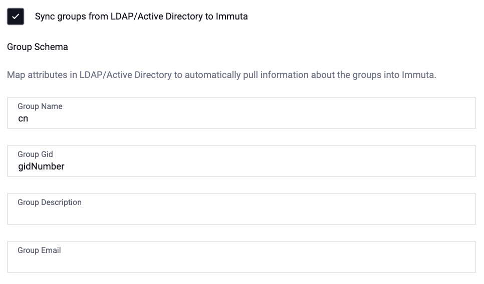 Identity managers that support group synchronization will have a group schema configuration option. This defines how group attributes are mapped in Immuta.