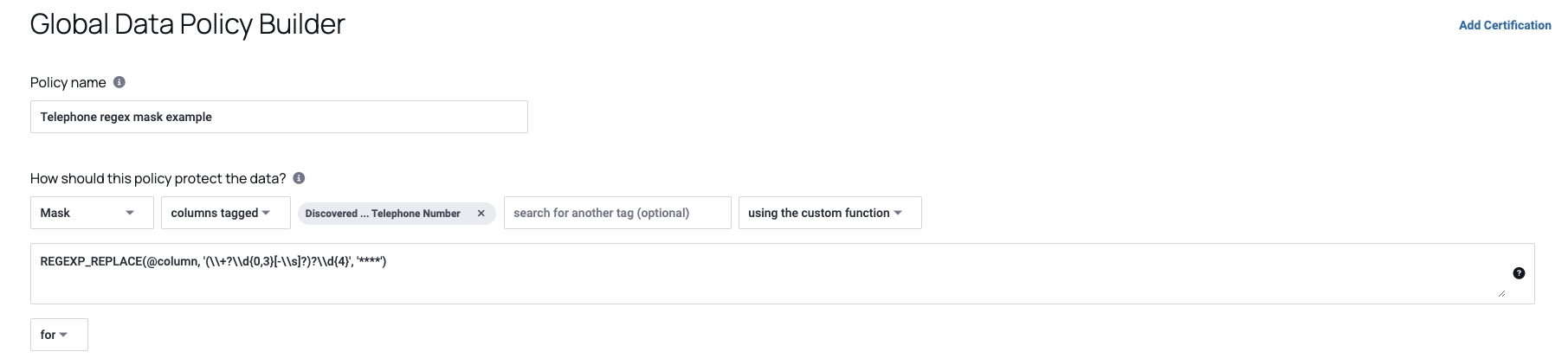 The image below illustrates authoring a regex global policy that will apply to Databricks Unity Catalog data sources: