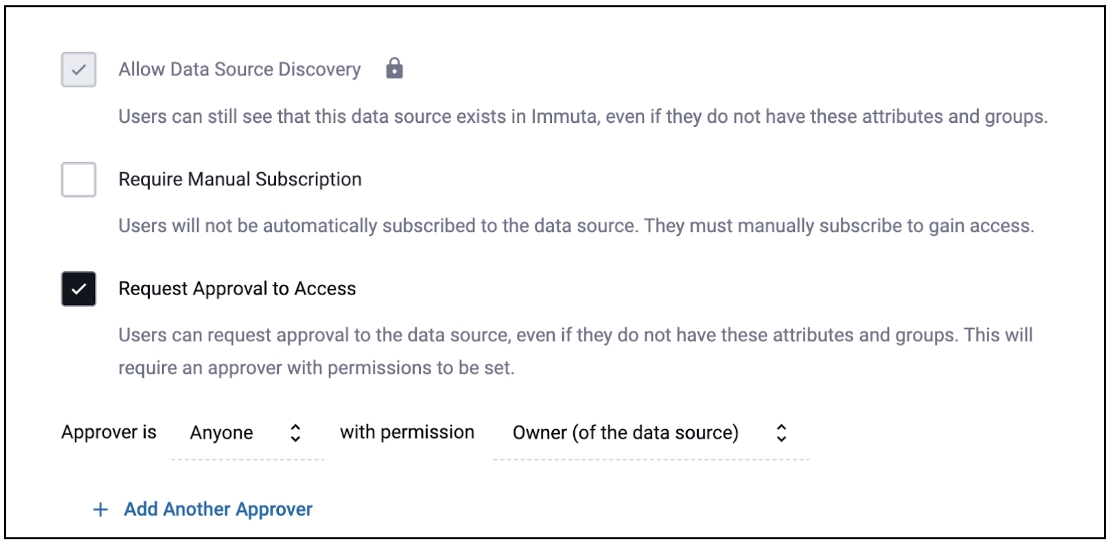 : normally, if you do not meet the criteria of a policy, the data source is not even visible to you in the Immuta UI or the data platform. However, if you have this checked, it is visible in the Immuta UI even if you don’t meet the policy. This must be checked in order to request approval to access. Otherwise, users would never find the data source to ask for approval in the Immuta UI.