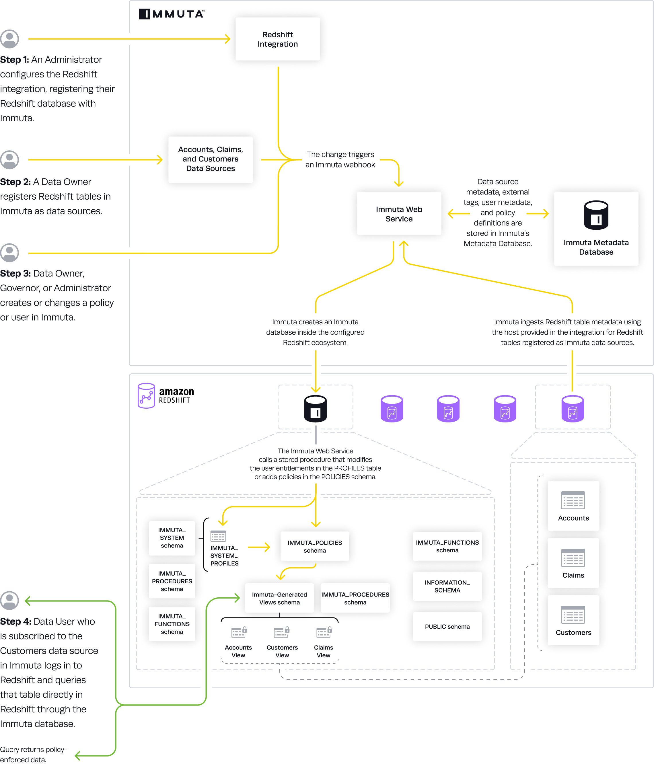 : Instead of creating an immuta database that manages all schemas and views created when Redshift data is registered in Immuta, the integration adds the Immuta-managed schemas and views to an existing database in Redshift.