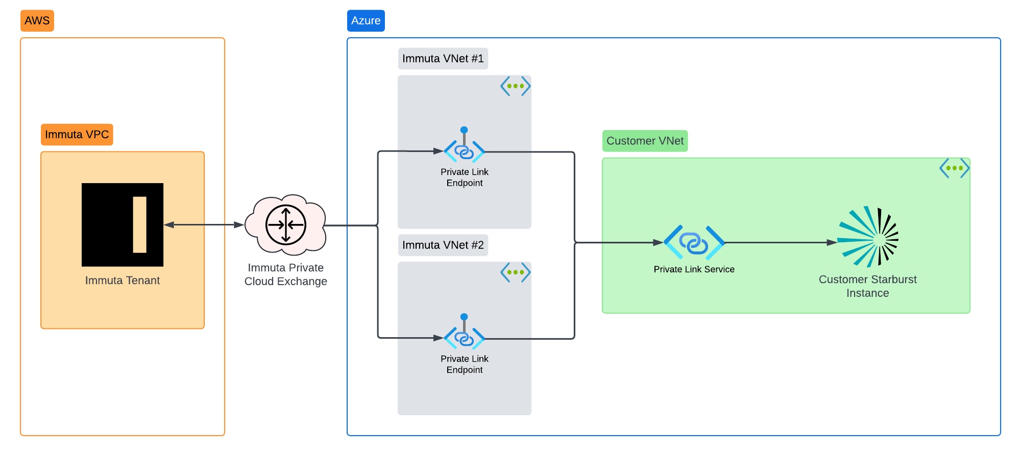 Azure Private Link provides private connectivity from the Immuta SaaS platform, hosted on AWS, to Starburst (Trino) clusters on Azure. It ensures that all traffic to the configured endpoints only traverses private networks over the Immuta Private Cloud Exchange.