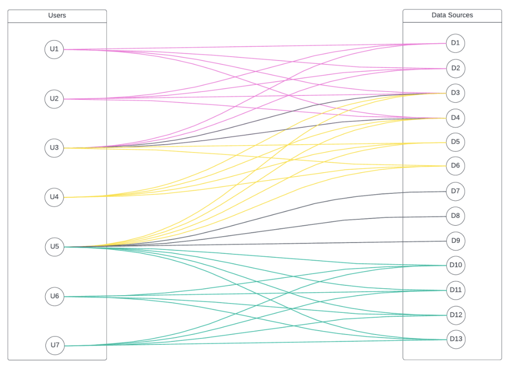 As an example, take the below users and data sources they have access to. To do this naively by individually granting every user to the tables they have access to would result in 37 grants: